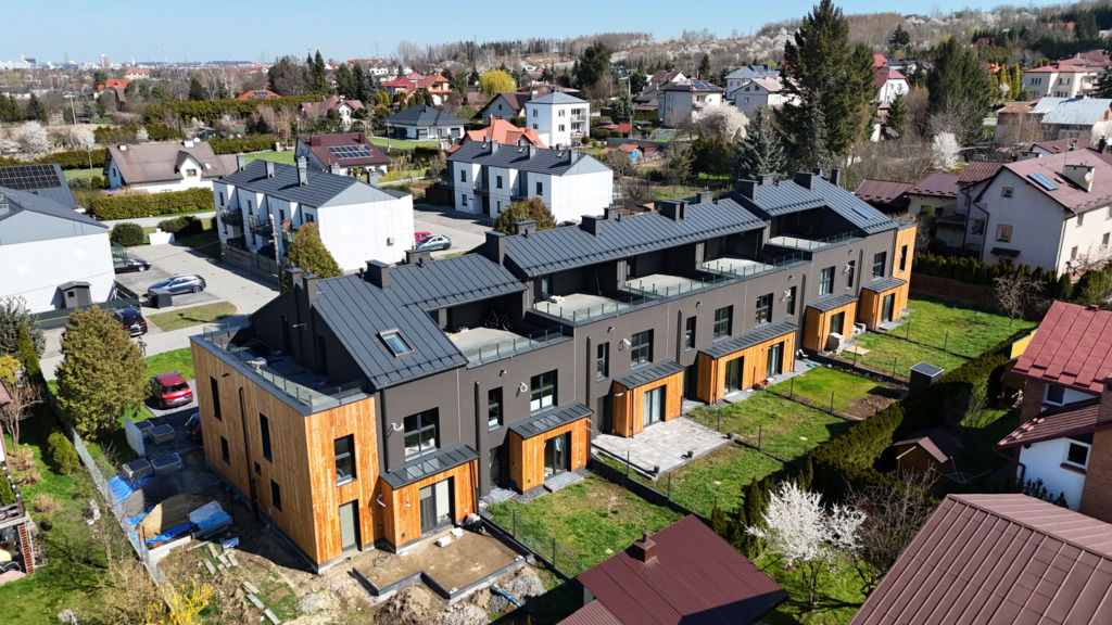 Inwestycję wyróżnia nowoczesna, elegancka architektura z elementami drewna, dużymi przeszkleniami oraz spójną, estetyczną zabudową szeregową. Kameralny charakter osiedla zapewnia poczucie prywatności i komfortu, a jednocześnie gwarantuje szybki dojazd do centrum miasta oraz łatwy dostęp do pełnej infrastruktury – szkół, sklepów, punktów usługowych i terenów rekreacyjnych.